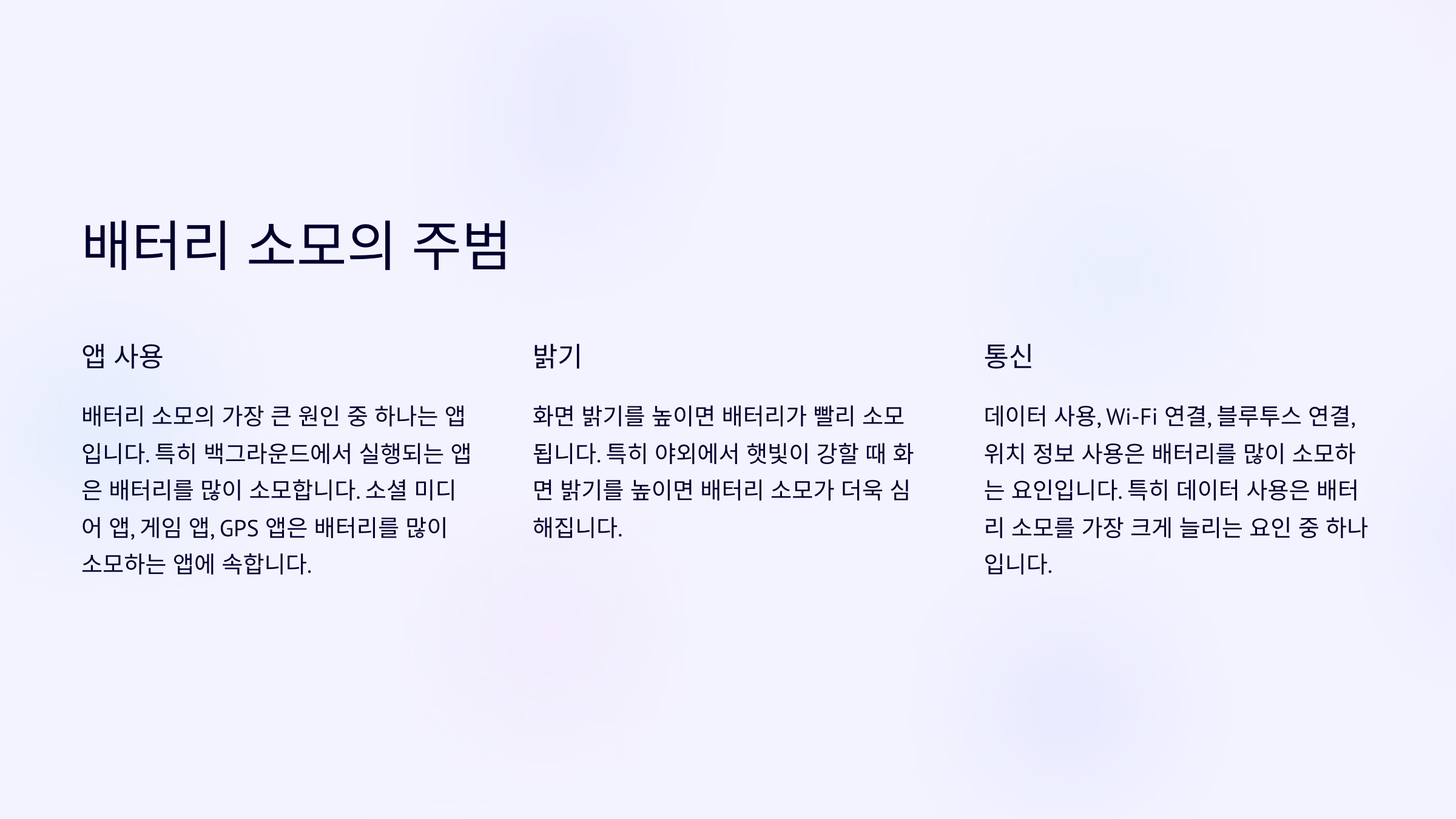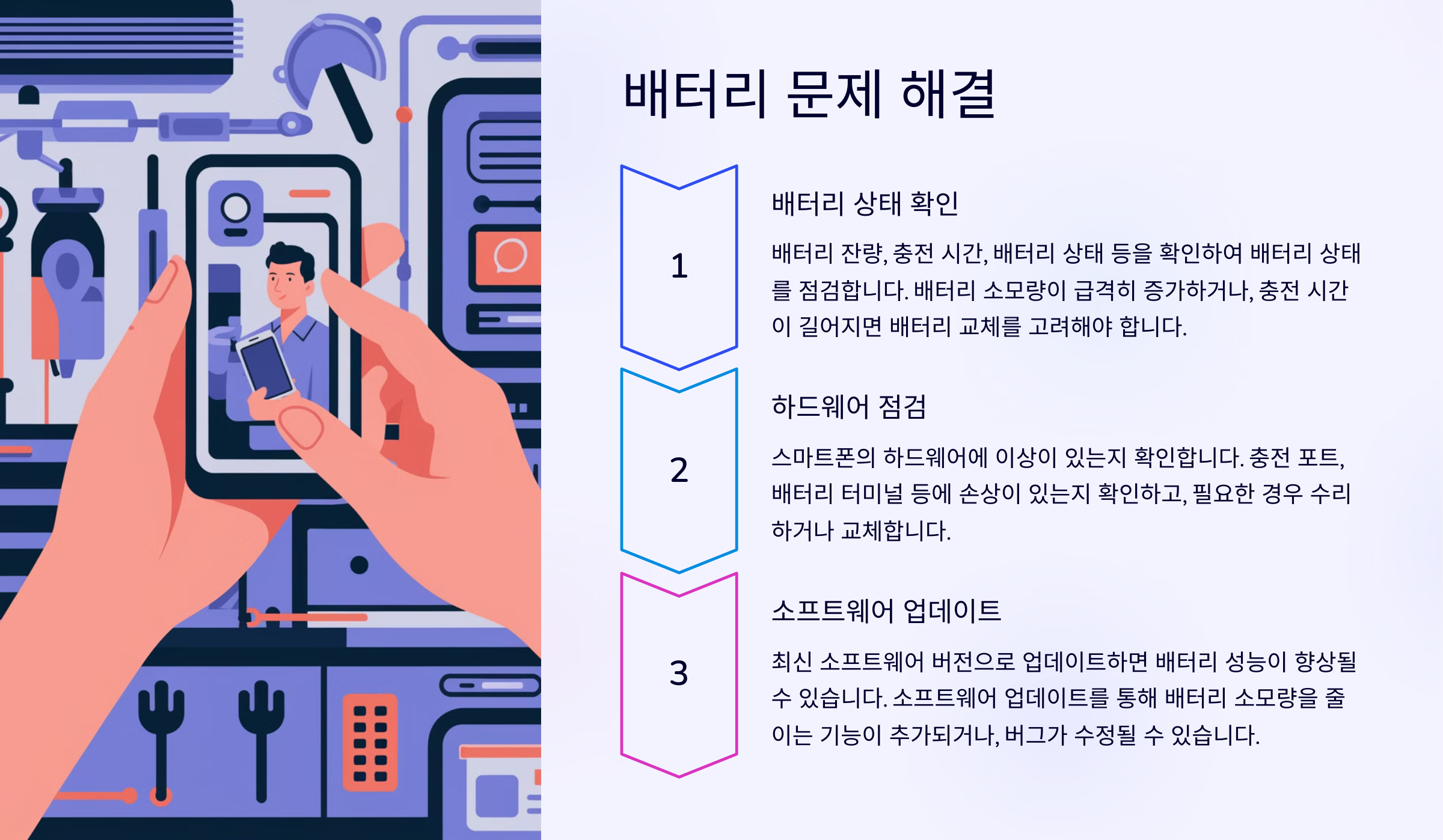 ๋ฐฐํฐ๋ฆฌ ์๋ช ์ด ์งง์์ง๋ ์์ธ์ ๋ค์ํด์. ์ค์ ๋ฌธ์ , ์ฑ ๊ณผ๋ค ์คํ, ๋ฐฑ๊ทธ๋ผ์ด๋ ํ๋ก์ธ์ค, ํ๋์จ์ด ๊ฒฐํจ ๋ฑ์ด ๋ฐฐํฐ๋ฆฌ ์๋ชจ๋ฅผ ๊ฐ์ํํ ์ ์๋ต๋๋ค. ํ์ง๋ง ๊ฑฑ์ ๋ง์ธ์! ์ฌ๋ฐ๋ฅธ ๋ฐฉ๋ฒ์ ์๋ฉด ๋ฐฐํฐ๋ฆฌ ์ง์ ์๊ฐ์ ํ์คํ๊ฒ ๋๋ฆด ์ ์์ด์. ๐