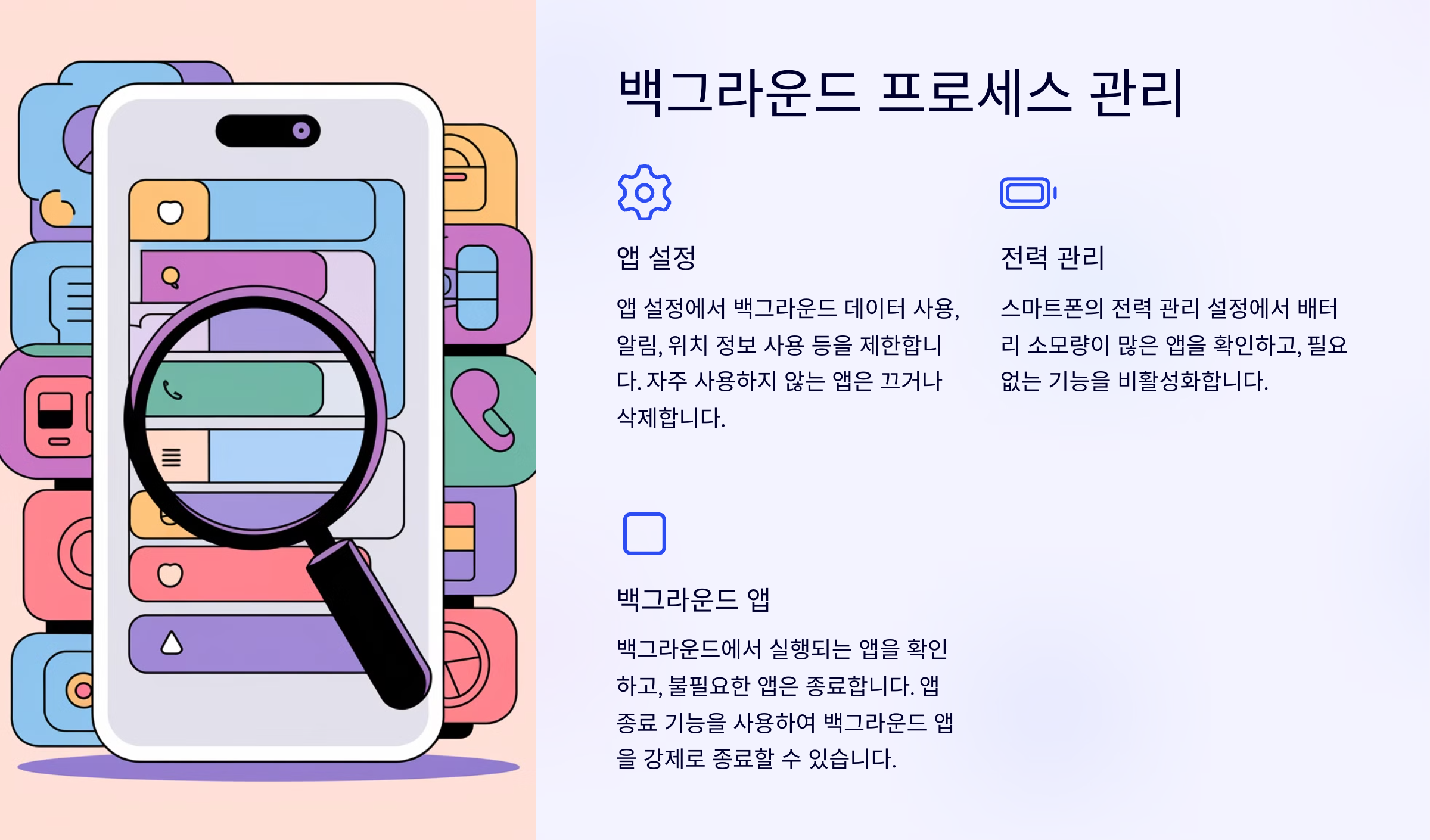 ์ค๋งํธํฐ์ ๋ฐฑ๊ทธ๋ผ์ด๋ ํ๋ก์ธ์ค๊ฐ ๋๋ฌด ๋ง์ผ๋ฉด ๋ฐฐํฐ๋ฆฌ๊ฐ ๋น ๋ฅด๊ฒ ์๋ชจ๋ ์ ์์ด์. ๋ถํ์ํ ํ๋ก์ธ์ค๋ฅผ ์ค์ด๋ ๋ฐฉ๋ฒ์ ์์๋ณผ๊น์? ๐