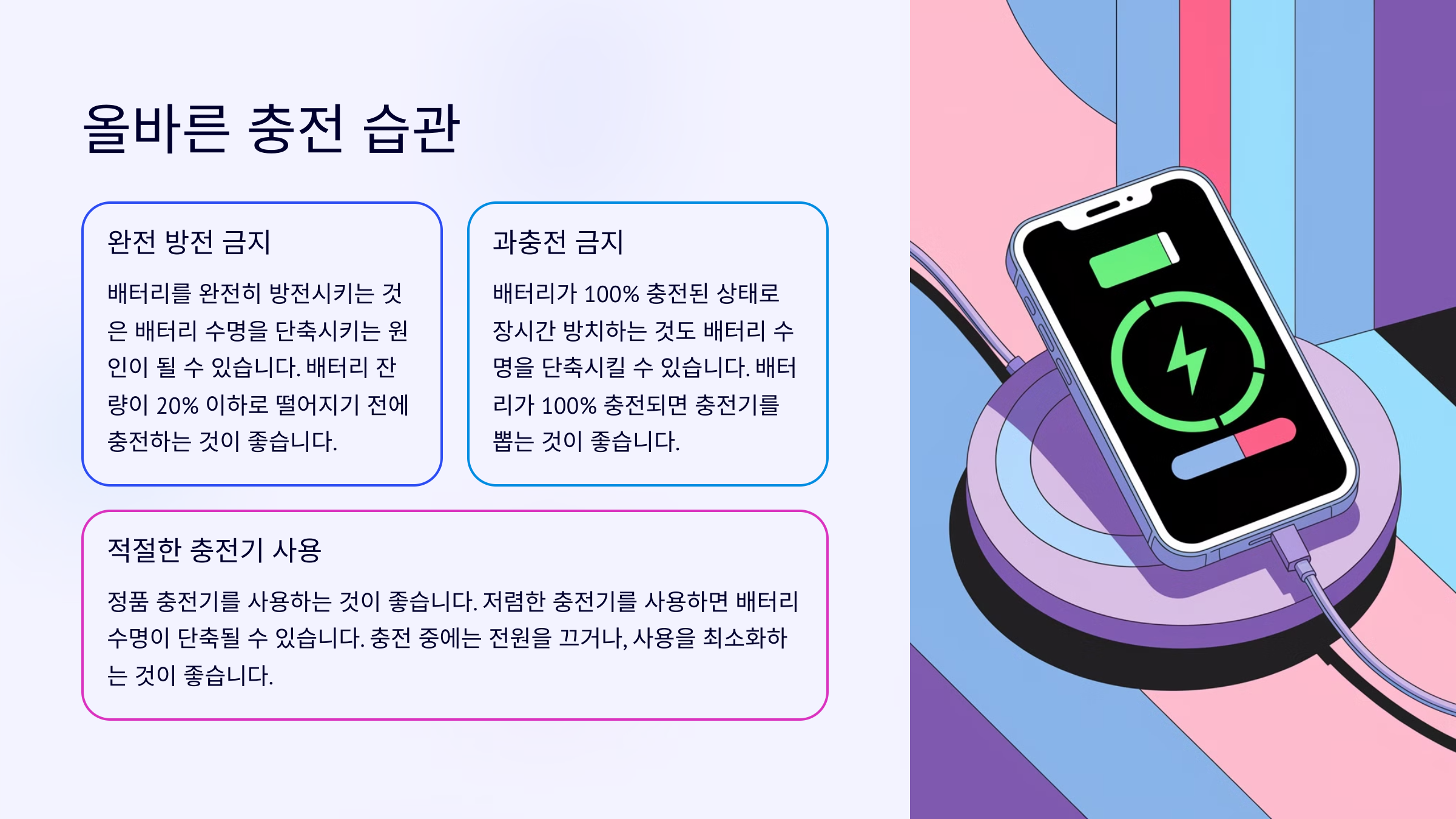 ๋ฐฐํฐ๋ฆฌ๋ฅผ ์ค๋ ์ฌ์ฉํ๋ ค๋ฉด ์ฌ๋ฐ๋ฅธ ์ถฉ์ ์ต๊ด์ ์ ์งํ๋ ๊ฒ์ด ์ค์ํด์. ์๋ชป๋ ์ถฉ์ ๋ฐฉ์์ ๋ฐฐํฐ๋ฆฌ ์๋ช ์ ๋จ์ถ์ํฌ ์ ์์ด์! โก