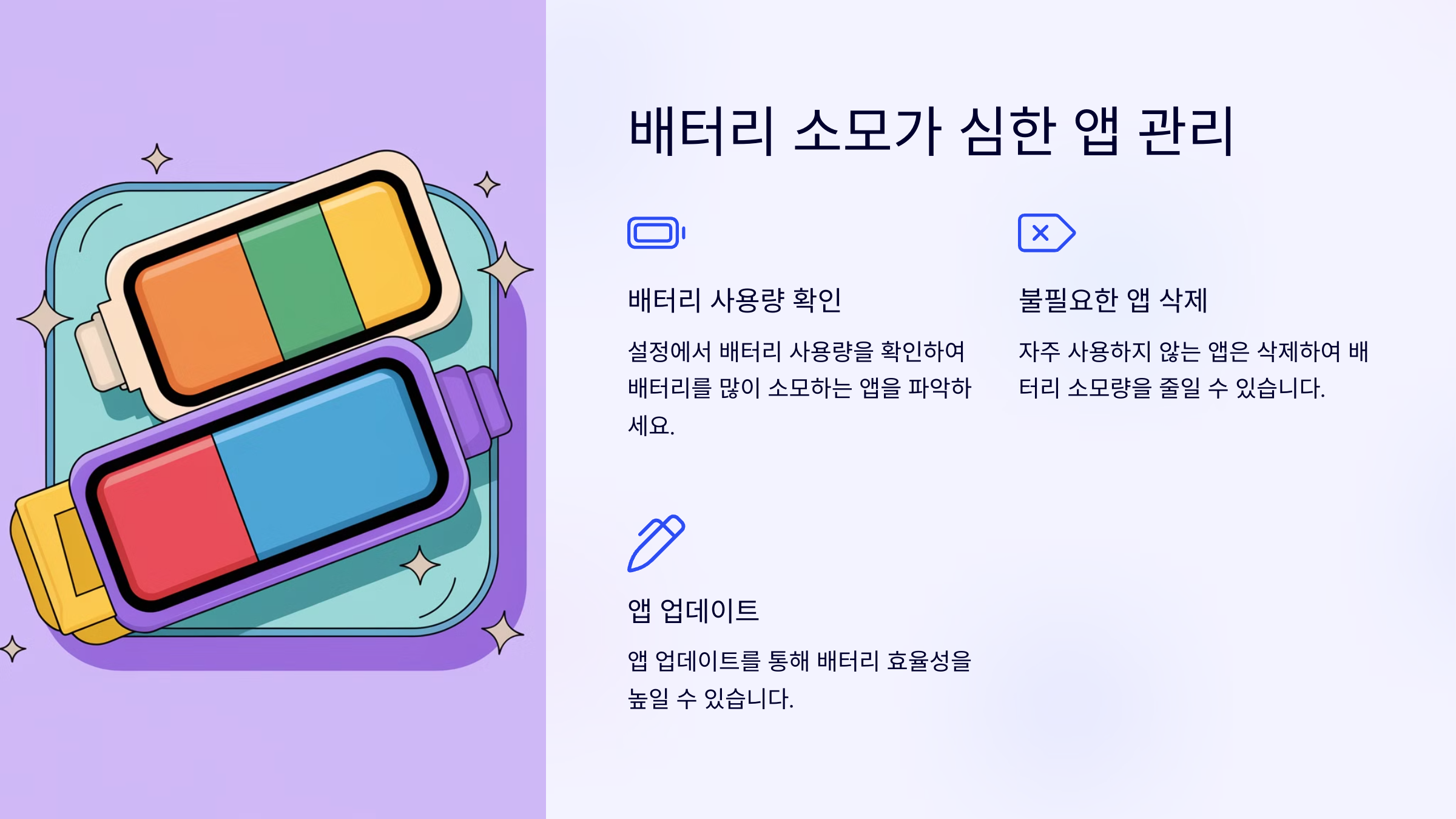 ๐ ๋ฐฐํฐ๋ฆฌ ๊ด๋ฆฌ๋ง ์ํด๋ ์ค๋งํธํฐ์ ๋ ์ค๋ ์ฌ์ฉํ ์ ์์ด์! ์ด ๊ฟํ๋ค์ ํ์ฉํด์ ๋ฐฐํฐ๋ฆฌ ์๋ช ์ 2๋ฐฐ ๋๋ ค ๋ณด์ธ์.