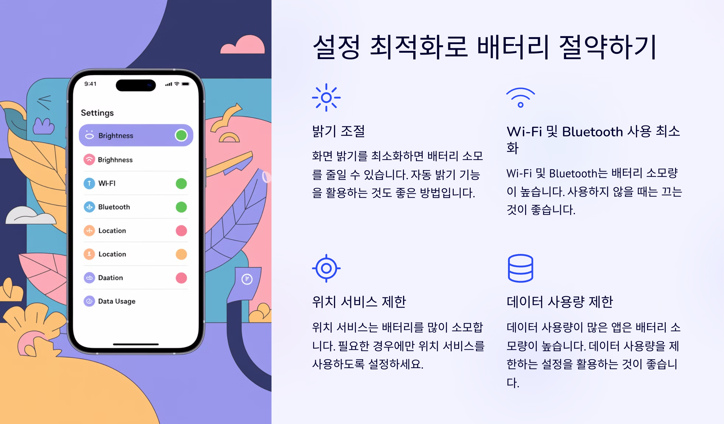 ๋ฐฐํฐ๋ฆฌ๋ฅผ ์ค๋ ์ฐ๋ ค๋ฉด ์ค๋งํธํฐ ์ค์ ์ ์ต์ ํํ๋ ๊ฒ์ด ์ค์ํด์. ๊ฐ๋จํ ์ค์ ๋ณ๊ฒฝ๋ง์ผ๋ก๋ ๋ฐฐํฐ๋ฆฌ ์๋ชจ๋ฅผ ํจ๊ณผ์ ์ผ๋ก ์ค์ผ ์ ์๋ต๋๋ค! โ๏ธ