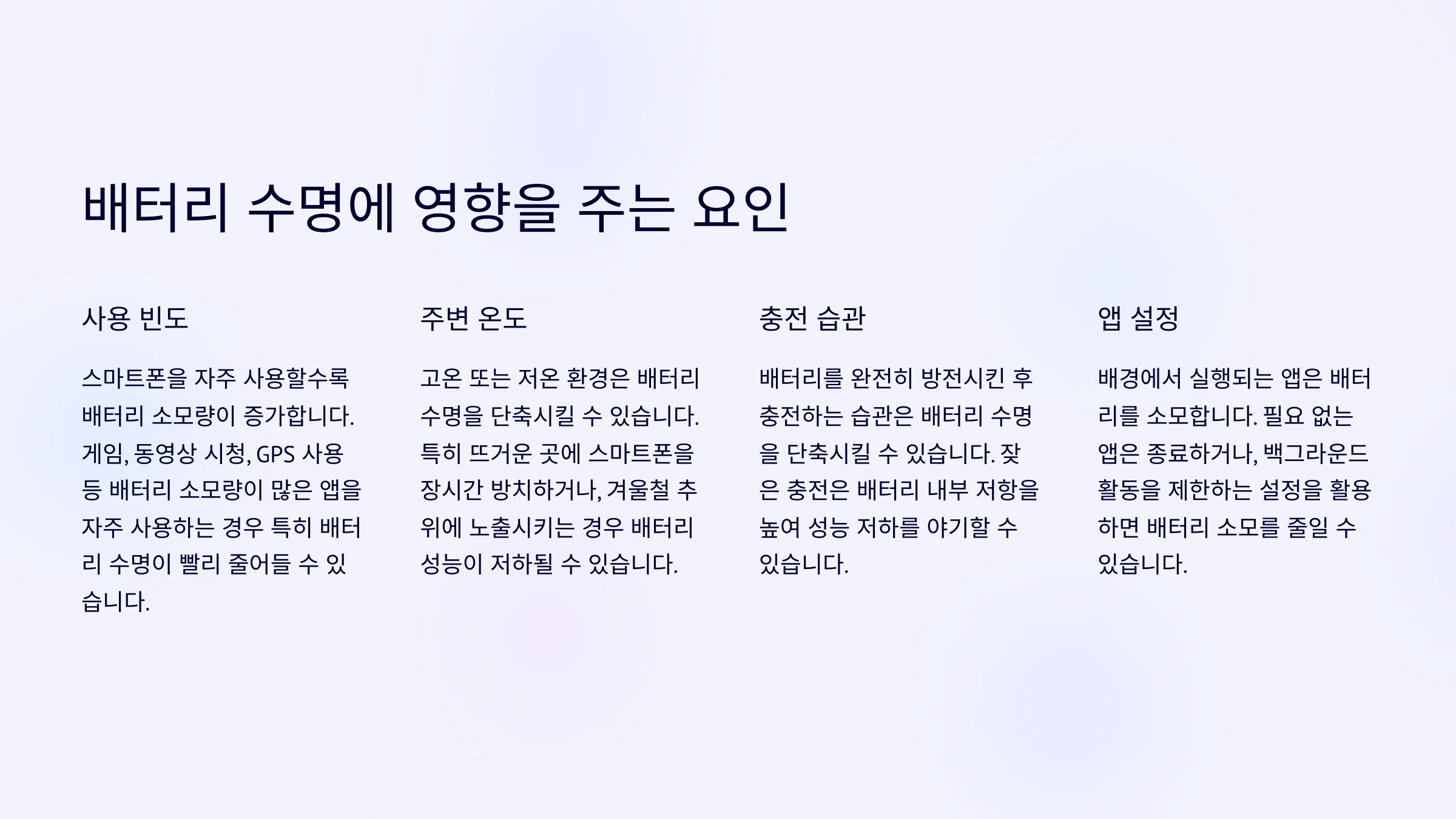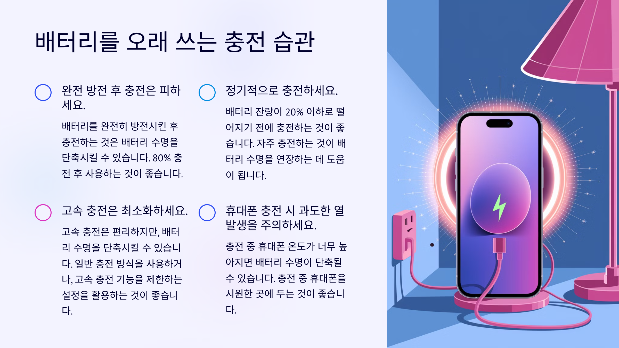 ๐ ์ด์ ๋ฐฐํฐ๋ฆฌ๋ฅผ ๋ ์ค๋ ์ฌ์ฉํ ์ ์๊ฒ ์ฃ ? ์ฌ๋ฐ๋ฅธ ์ฌ์ฉ ์ต๊ด์ผ๋ก ์ค๋งํธํฐ์ ๋ ํจ์จ์ ์ผ๋ก ๊ด๋ฆฌํด ๋ณด์ธ์! ๐